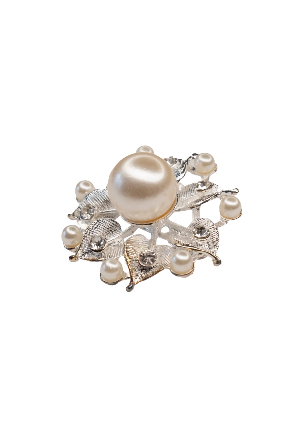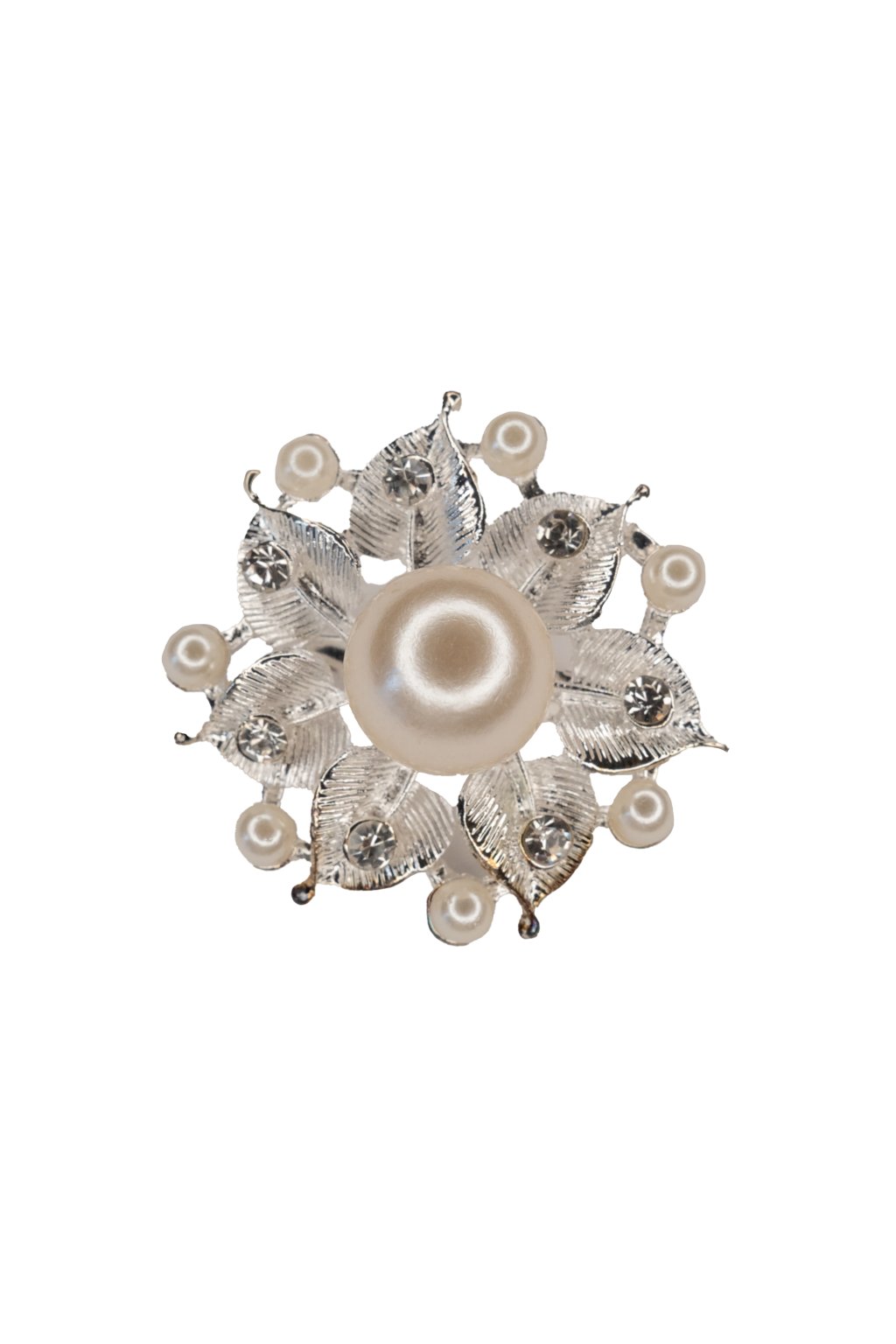 Kovová brošňa striebornej farby v tvare kvetu ozdobená bielymi perlami.