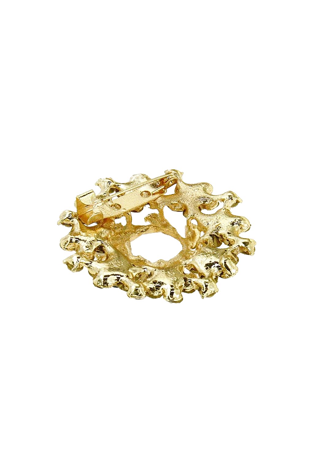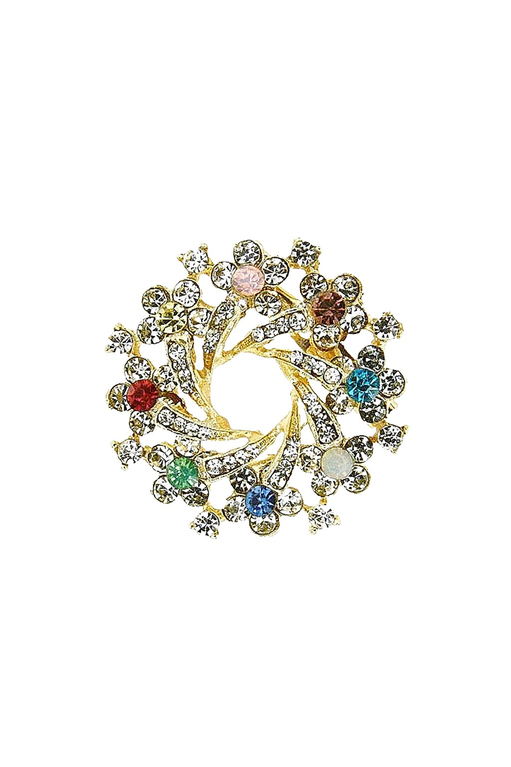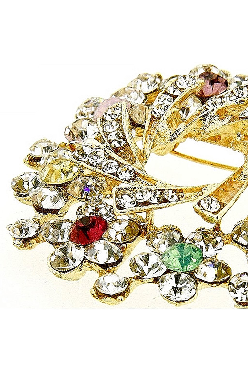 Kovová brošňa svetlozlatej farby s viacfarebnými kamienkami.