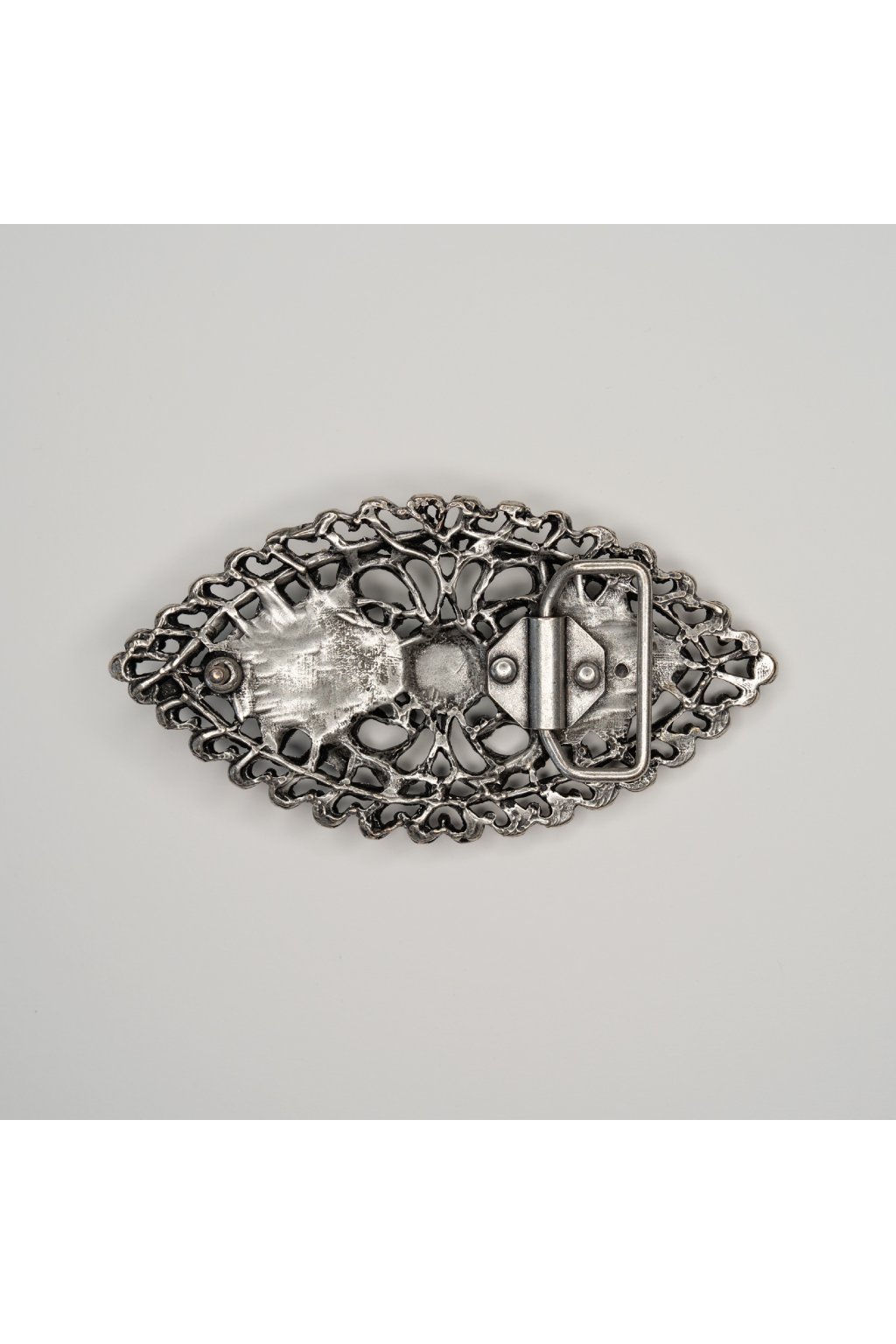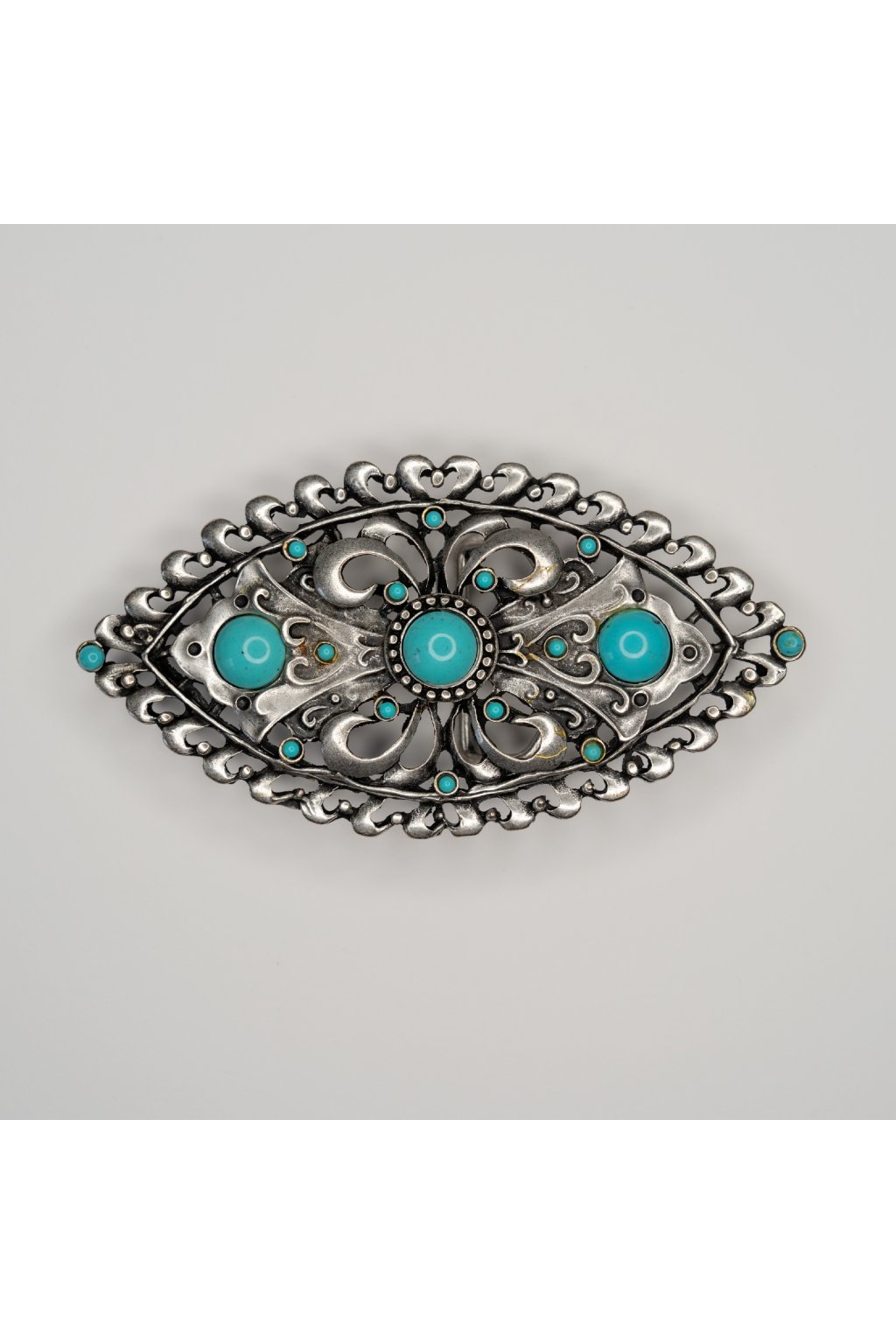 Luxusná dizajnová pracka na kožený opasok oválneho tvaru s centrálnym tyrkysovým oválom v striebornej patine. Pracka sa využíva najmä v koženom odvetví pri výrobe opaskov.