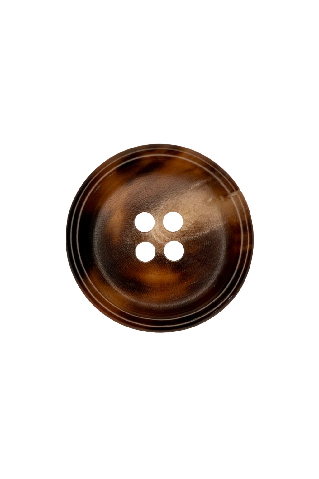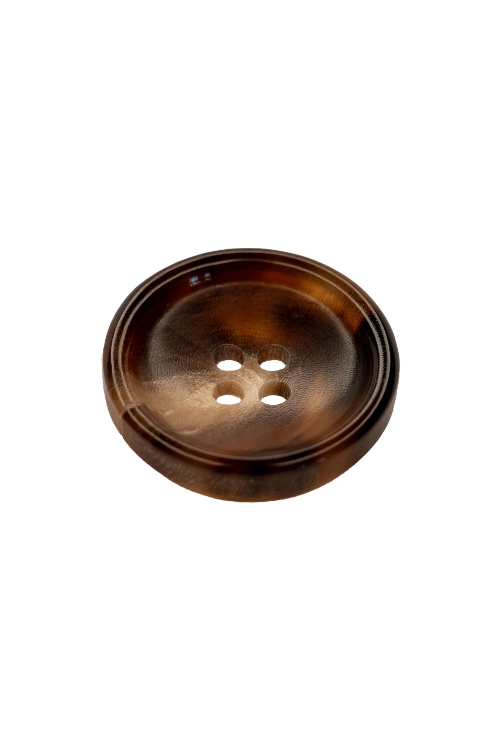 Plastový okrúhly gombík so štyrmi dierkami, mierne klenutý, hnedočiernej farby s vyzdvihnutým okrajom.