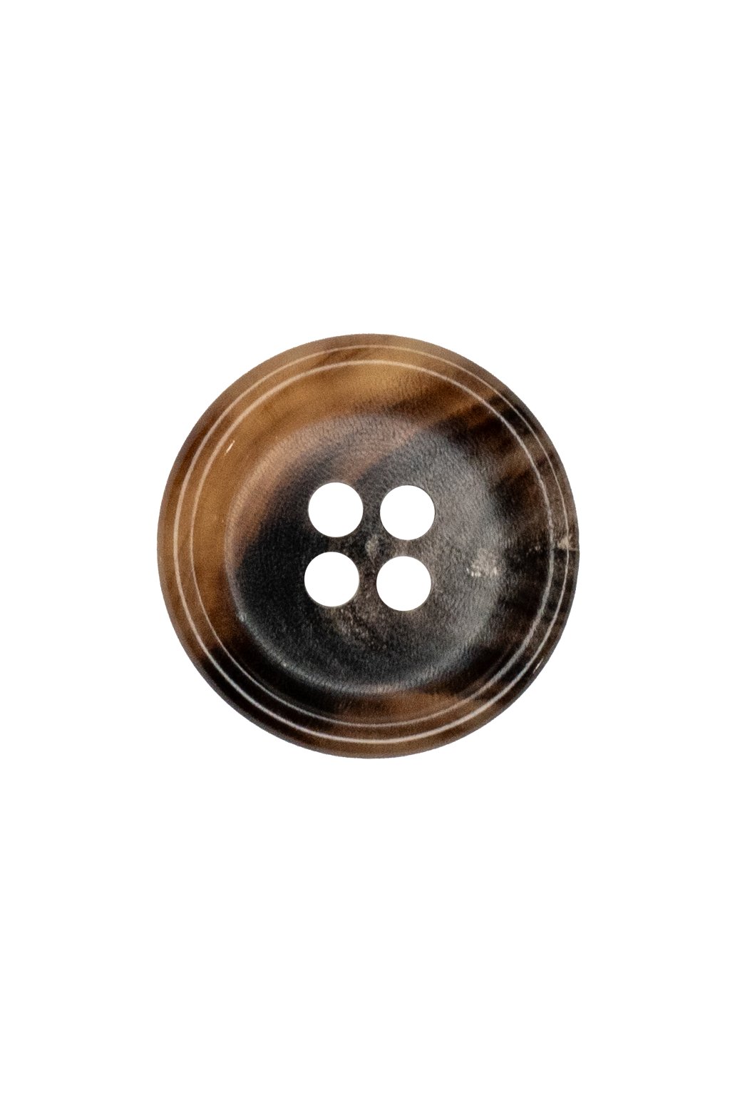 Plastový okrúhly gombík so štyrmi dierkami, mierne klenutý, s vyzdvihnutým okrajom, kostenej hnedej farby.