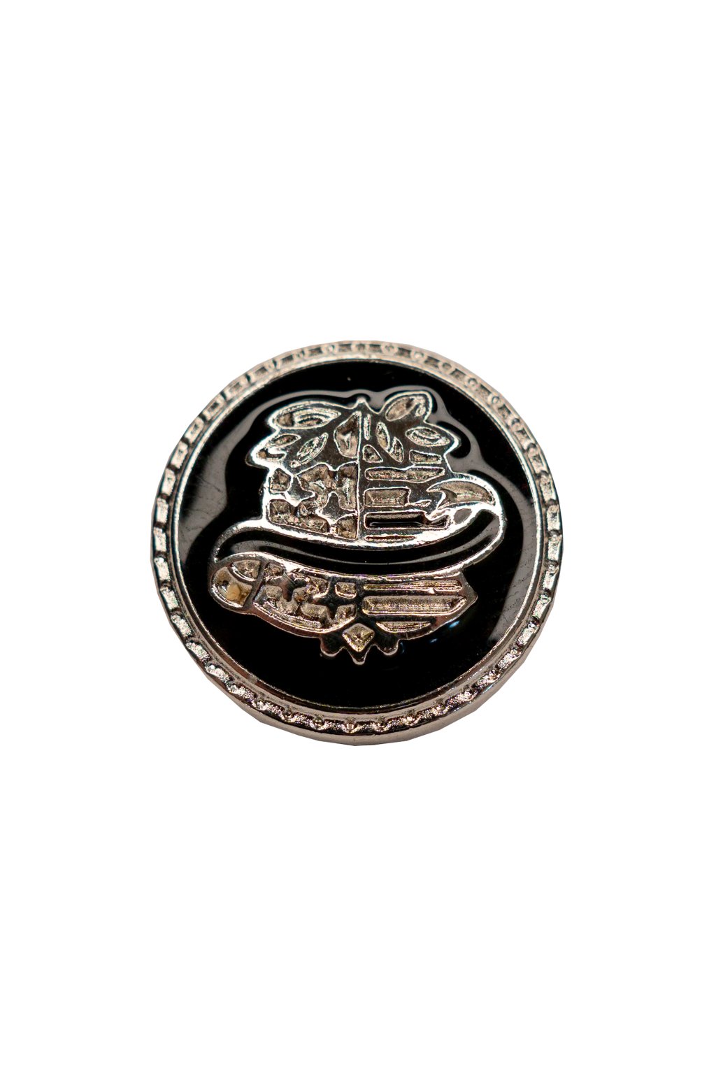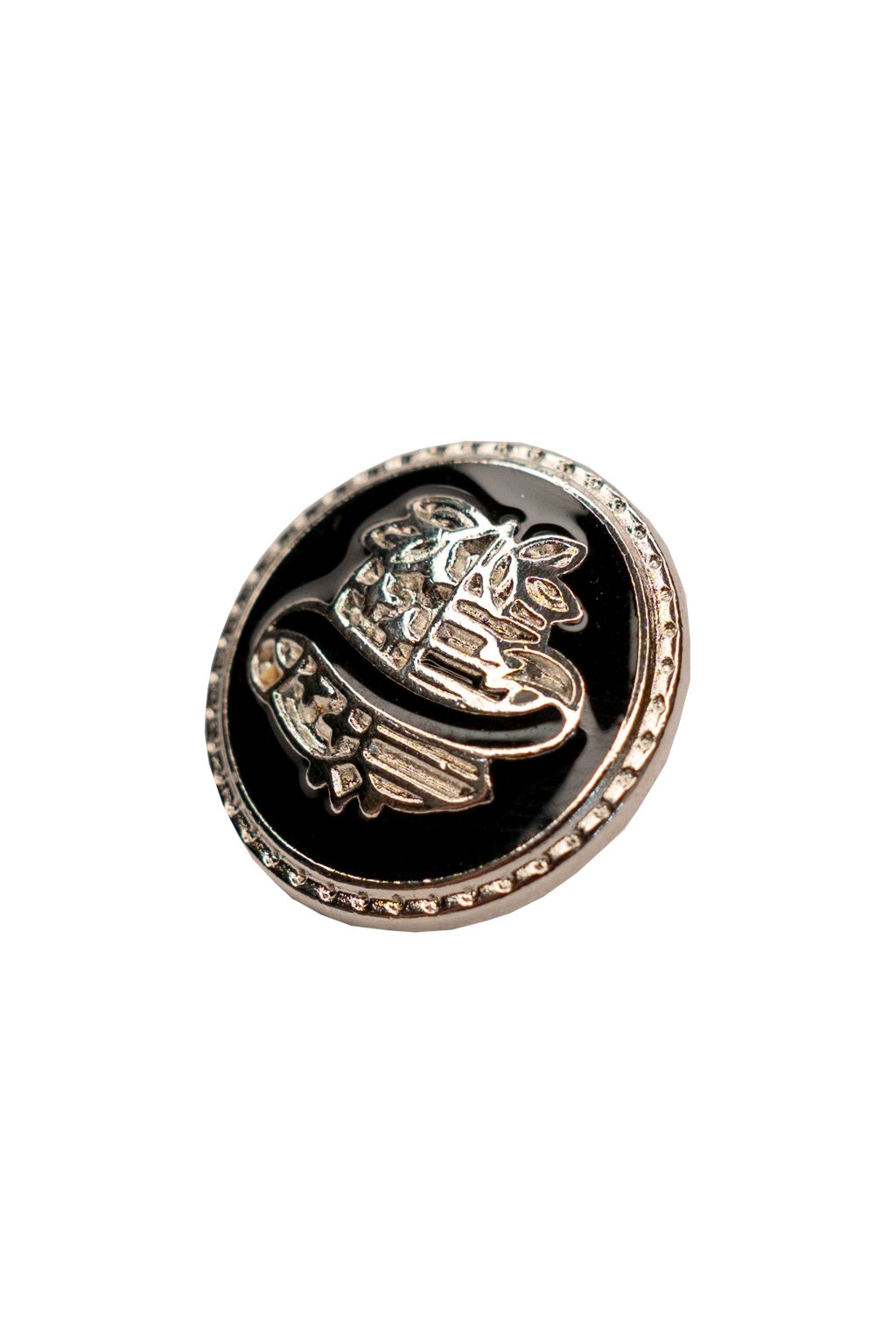 Efektný čierno strieborný kovový gombík s vygravírovaným erbom na vrchnej časti gombíka.