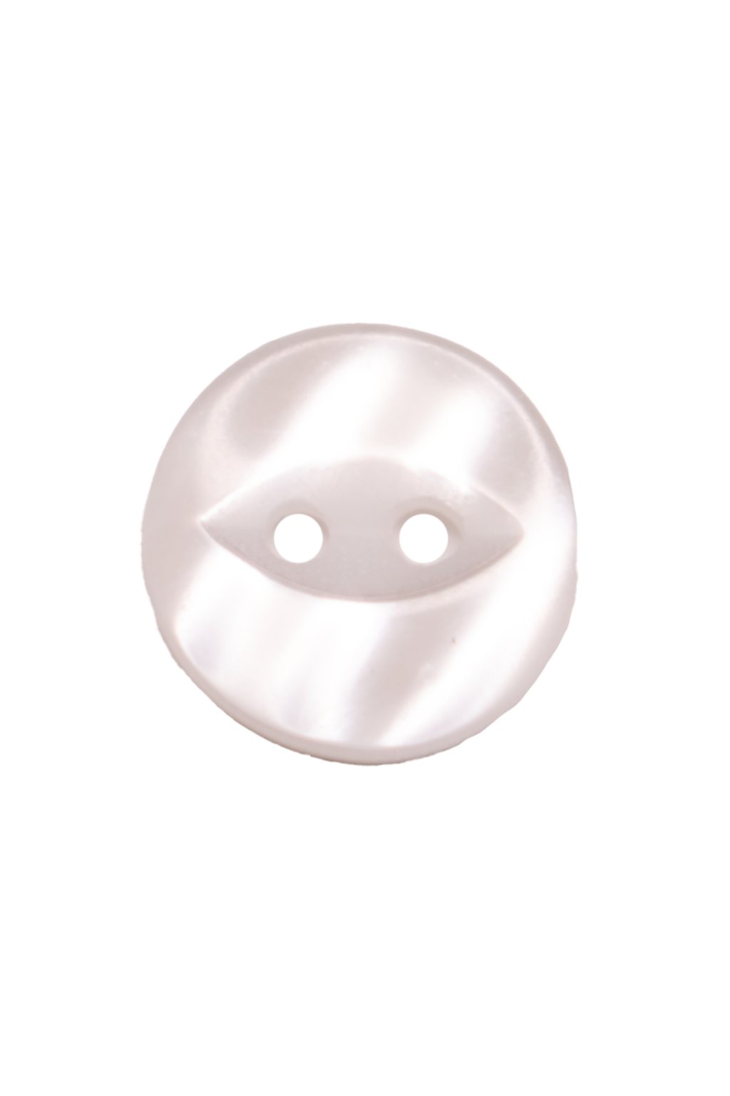 Plastový gombík okrúhleho tvaru s dvoma dierkami bielej farby s perleťovým efektom.