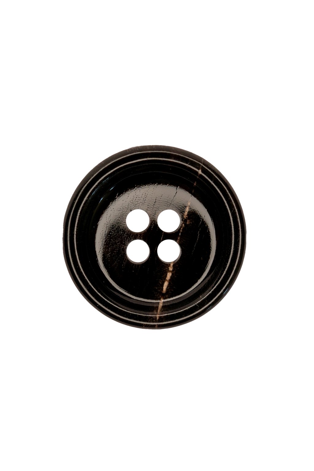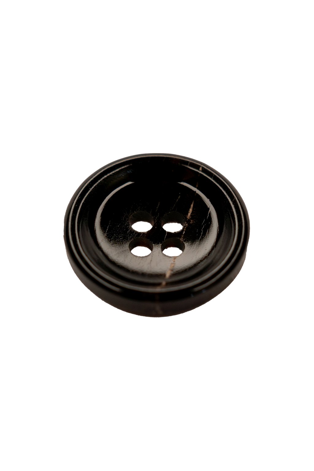 Plastový okrúhly malý gombík so štyrmi dierkami, mierne klenutý, s vyzdvihnutým okrajom, čiernej farby s jemným melírom.