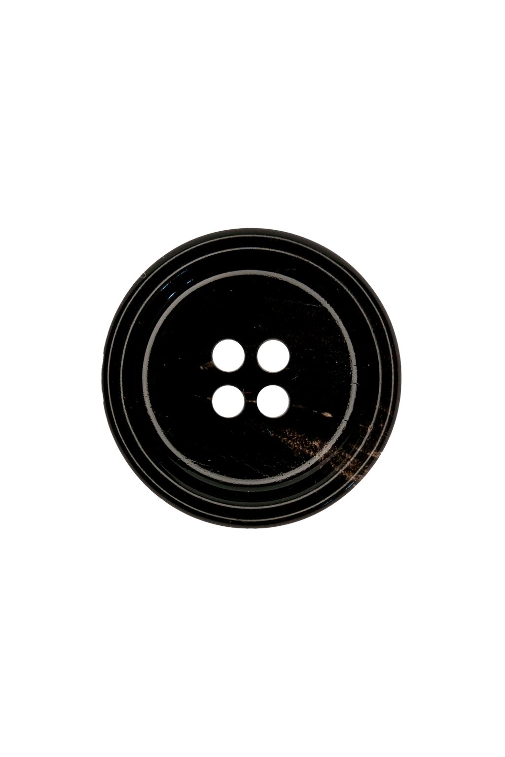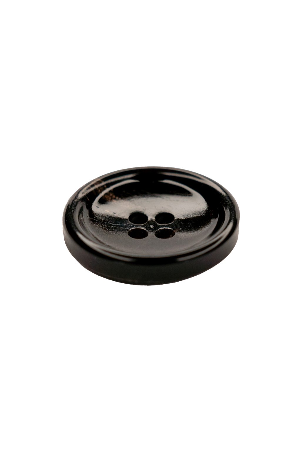 Plastový okrúhly stredný gombík so štyrmi dierkami, mierne klenutý, s vyzdvihnutým okrajom, čiernej farby miernym melírom.