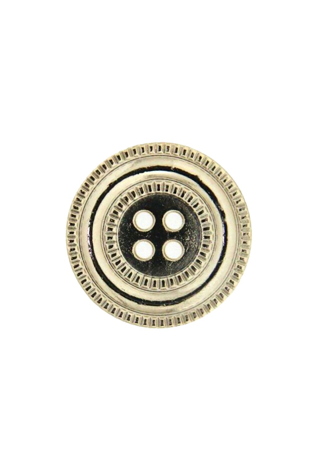 Efektný strieborný gombík so štyrmi dierkami so zvýraznenými kruhmi.