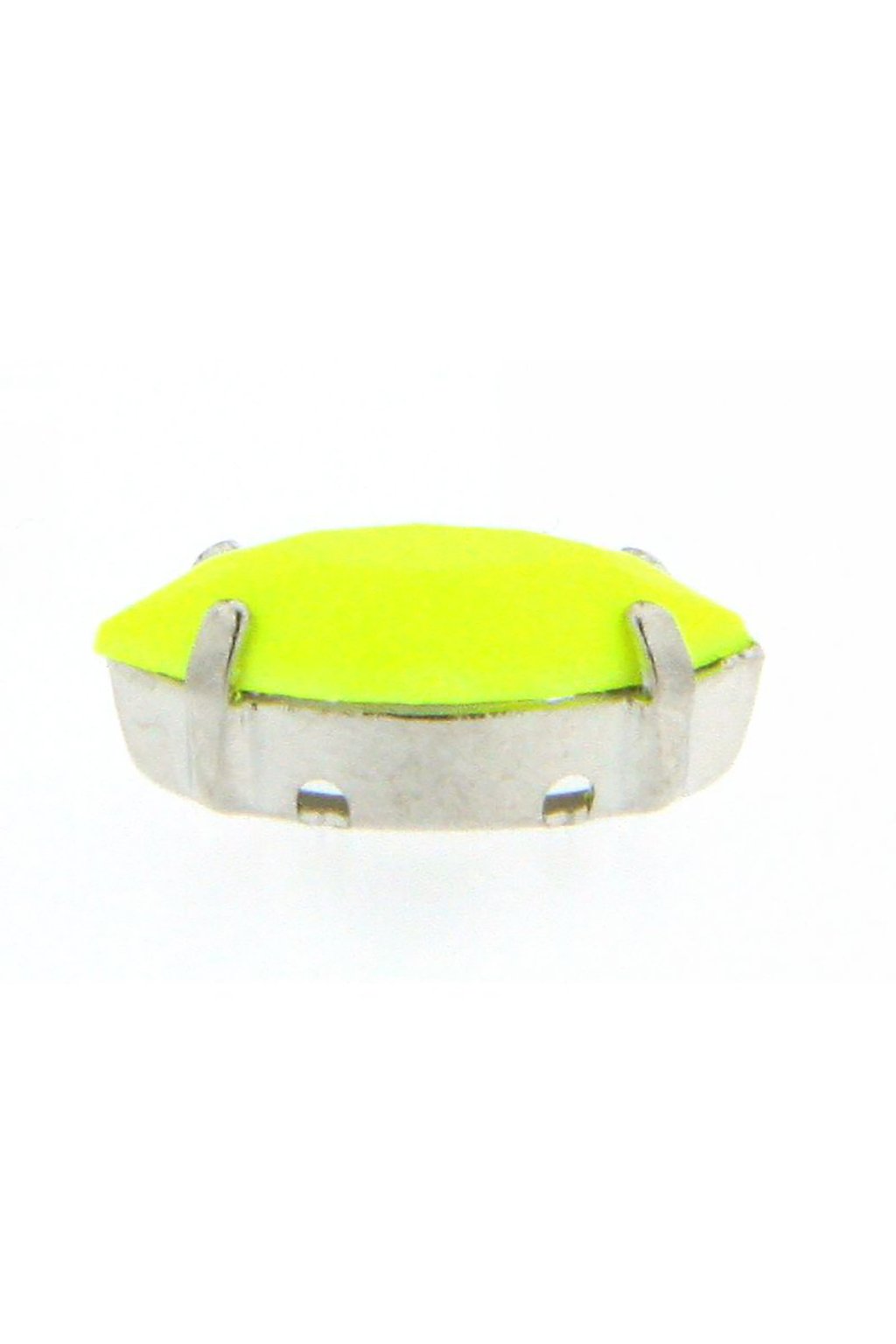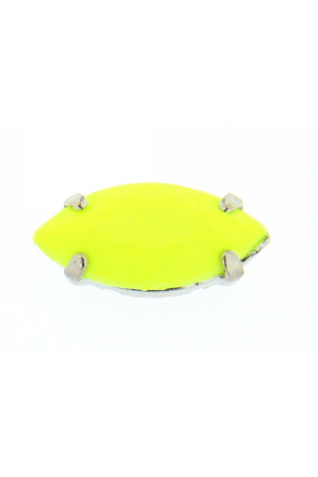 Ozdobný gombík slzičkového tvaru z pozinkovaného niklu s fluorescenčným neónovo žltým kamienkom.