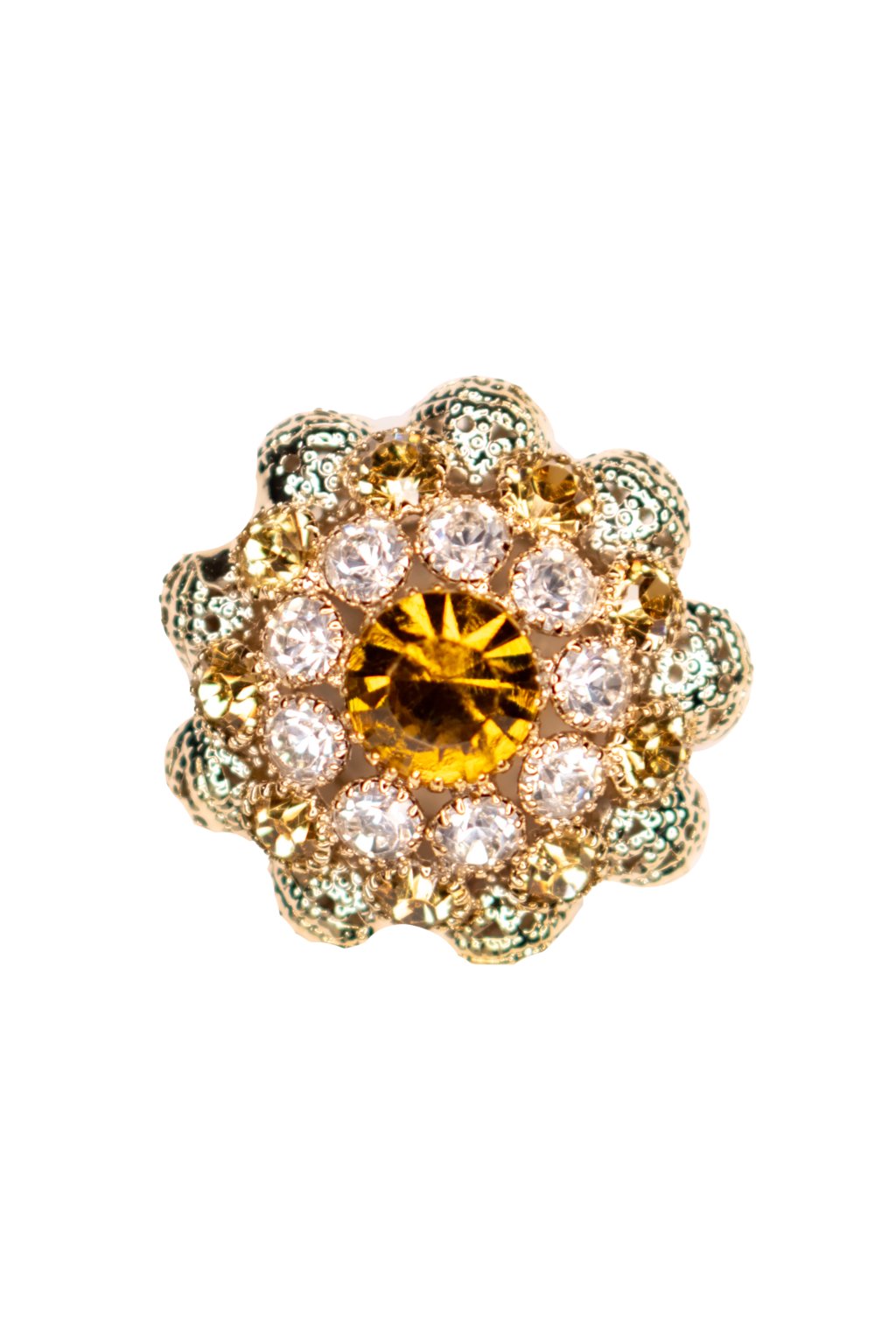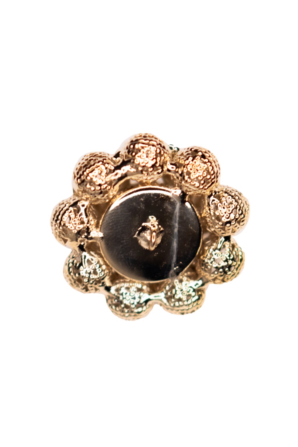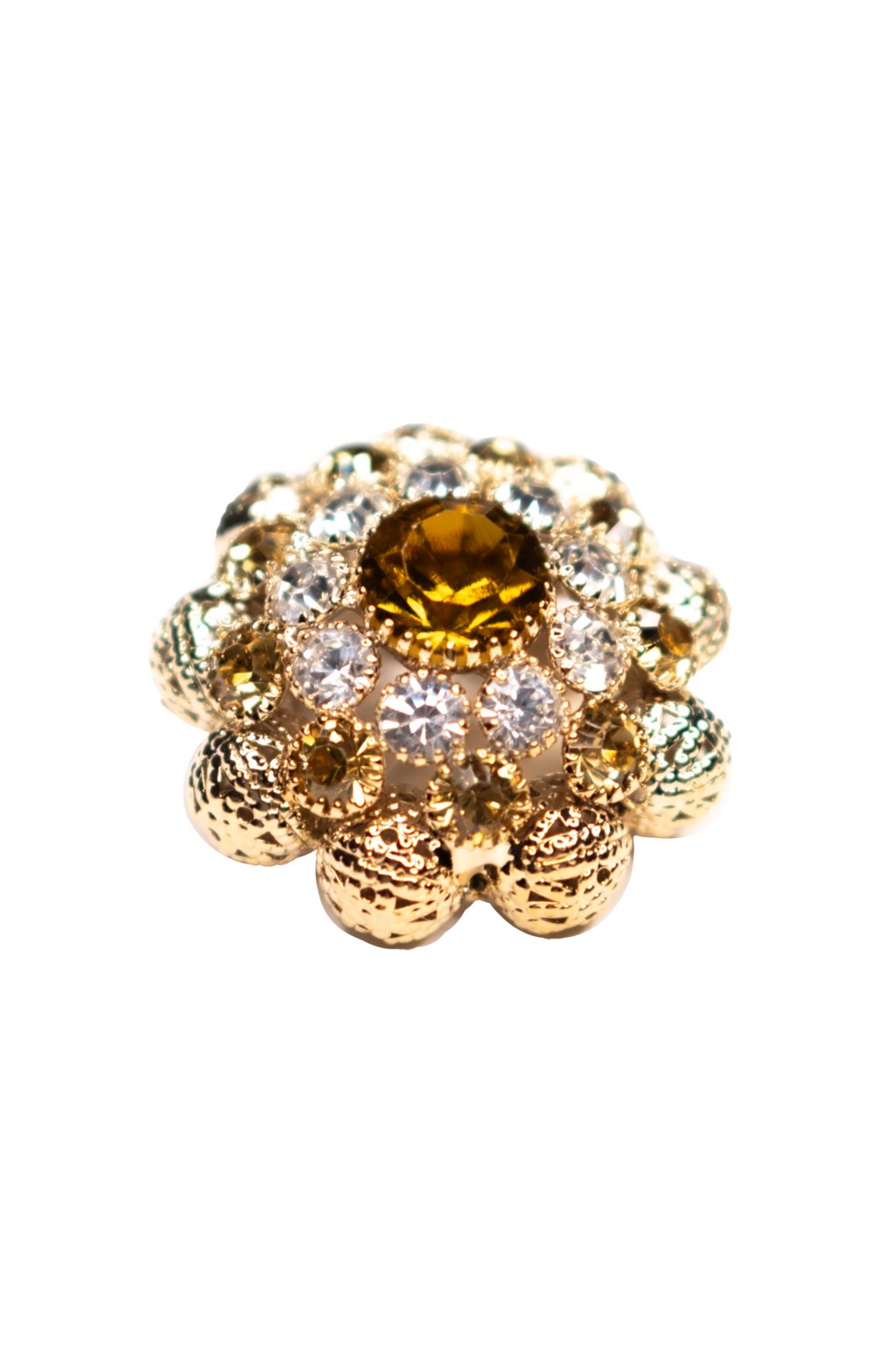 Extravagantný šperkový gombík z ružového zlata so vsadenými vybrúsenými kryštálovými a topásovými kamienkami.