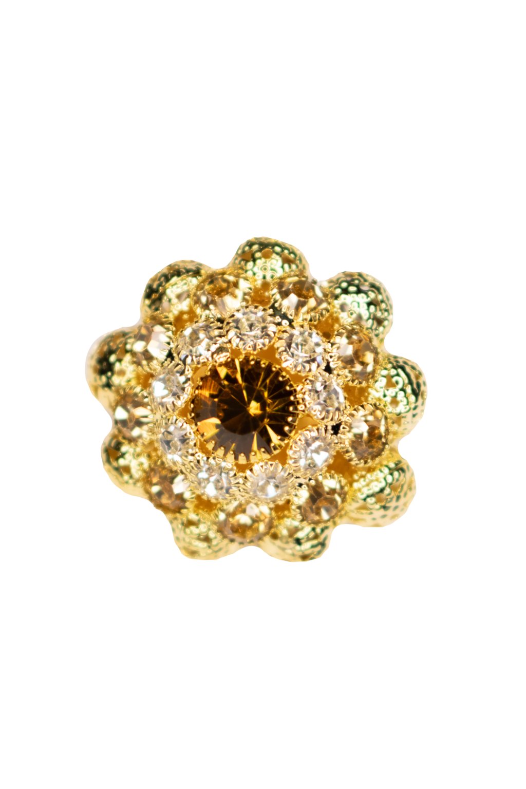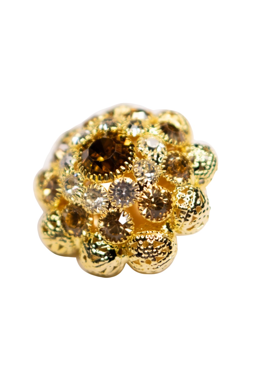 Extravagantný šperkový gombík zo žltého zlata so vsadenými vybrúsenými kryštálovými a topásovými kamienkami.