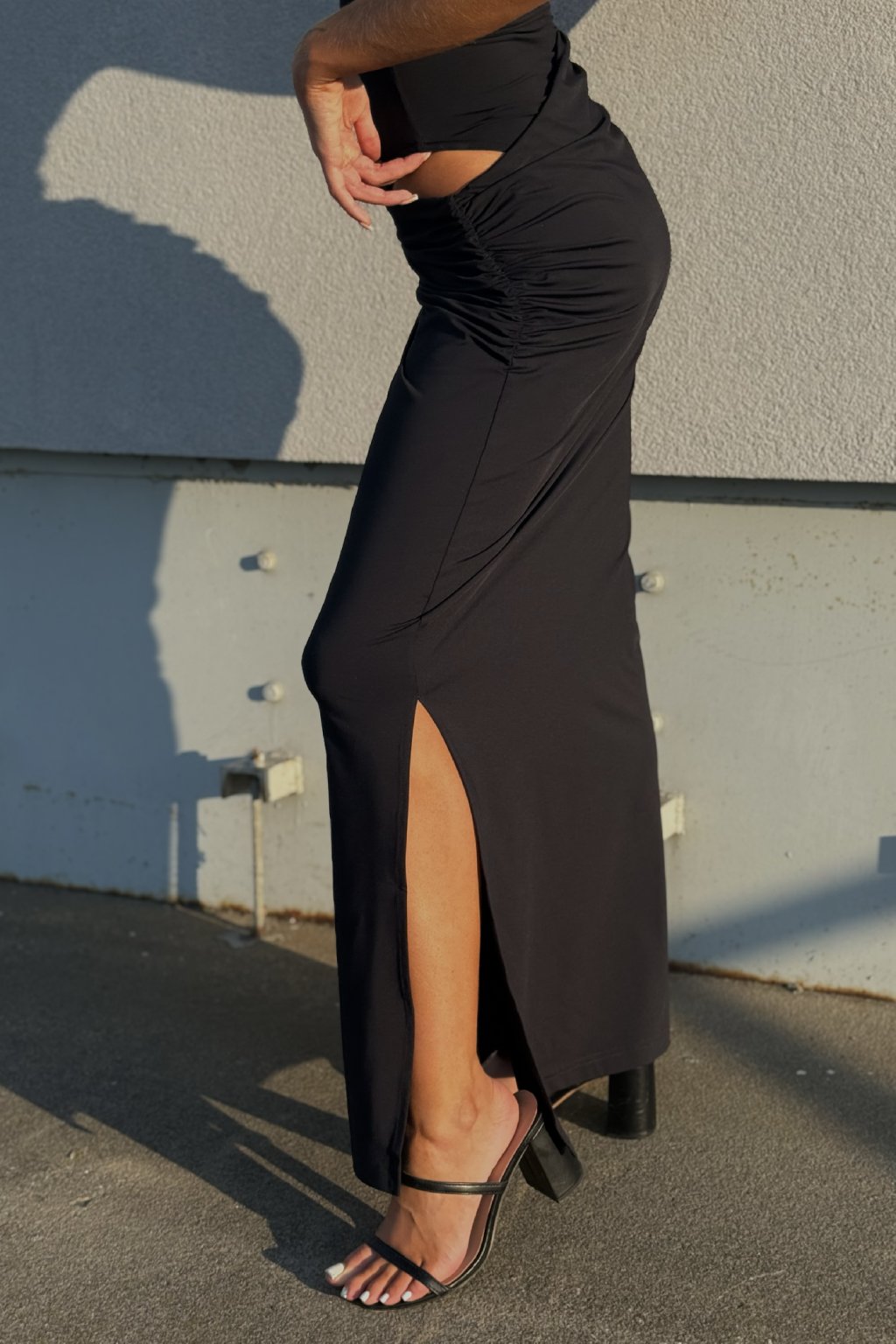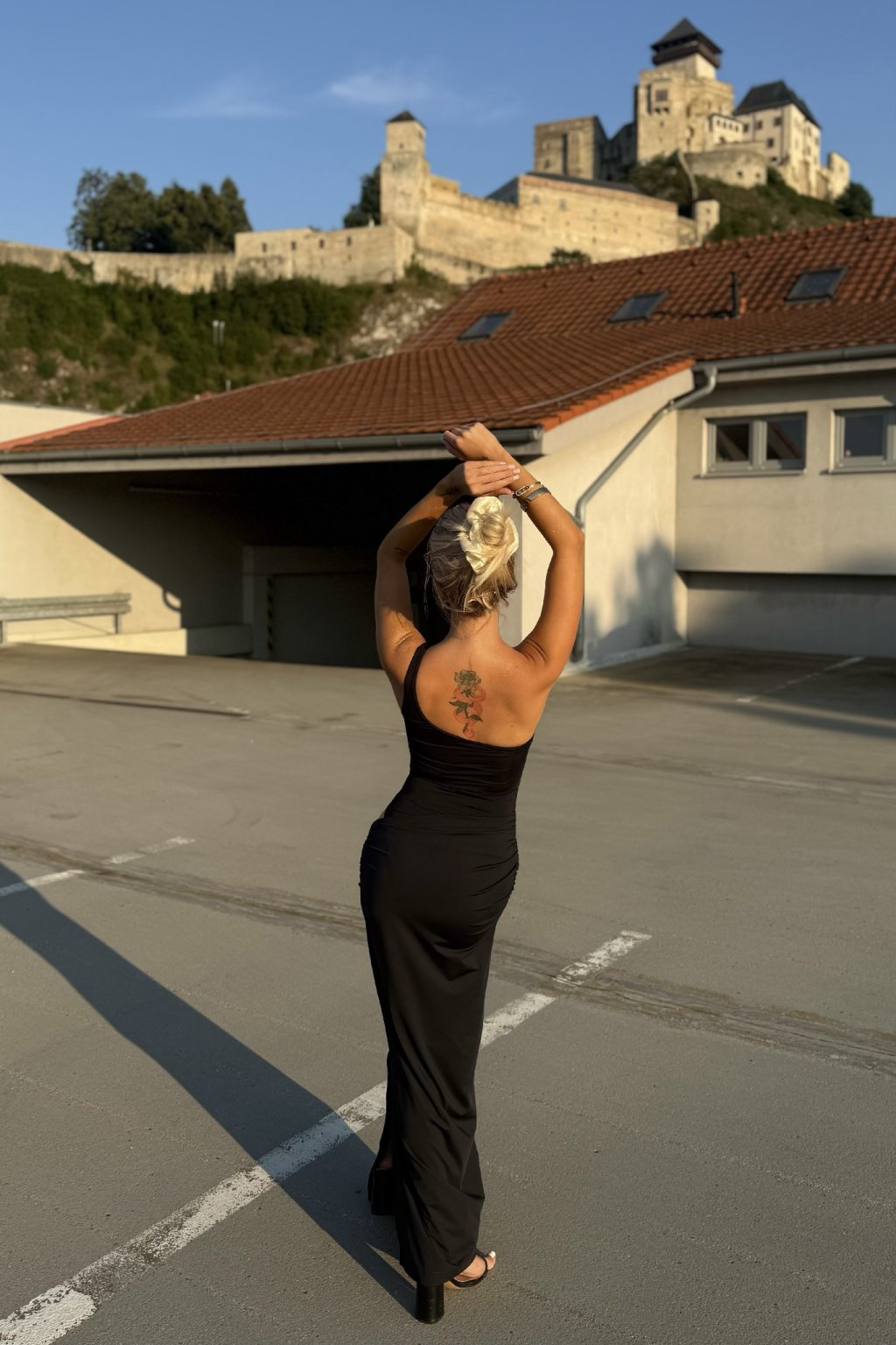 Čierne asymetrické maxi šaty navrhnuté pre ženy, ktoré milujú jednoduchosť a zároveň rafinovanosť.