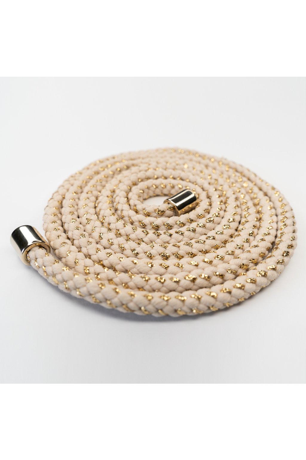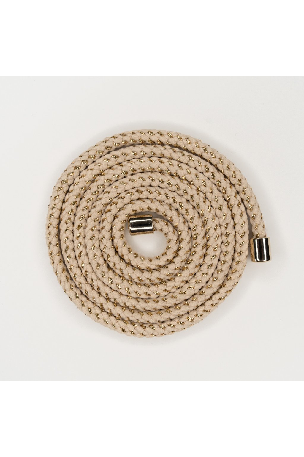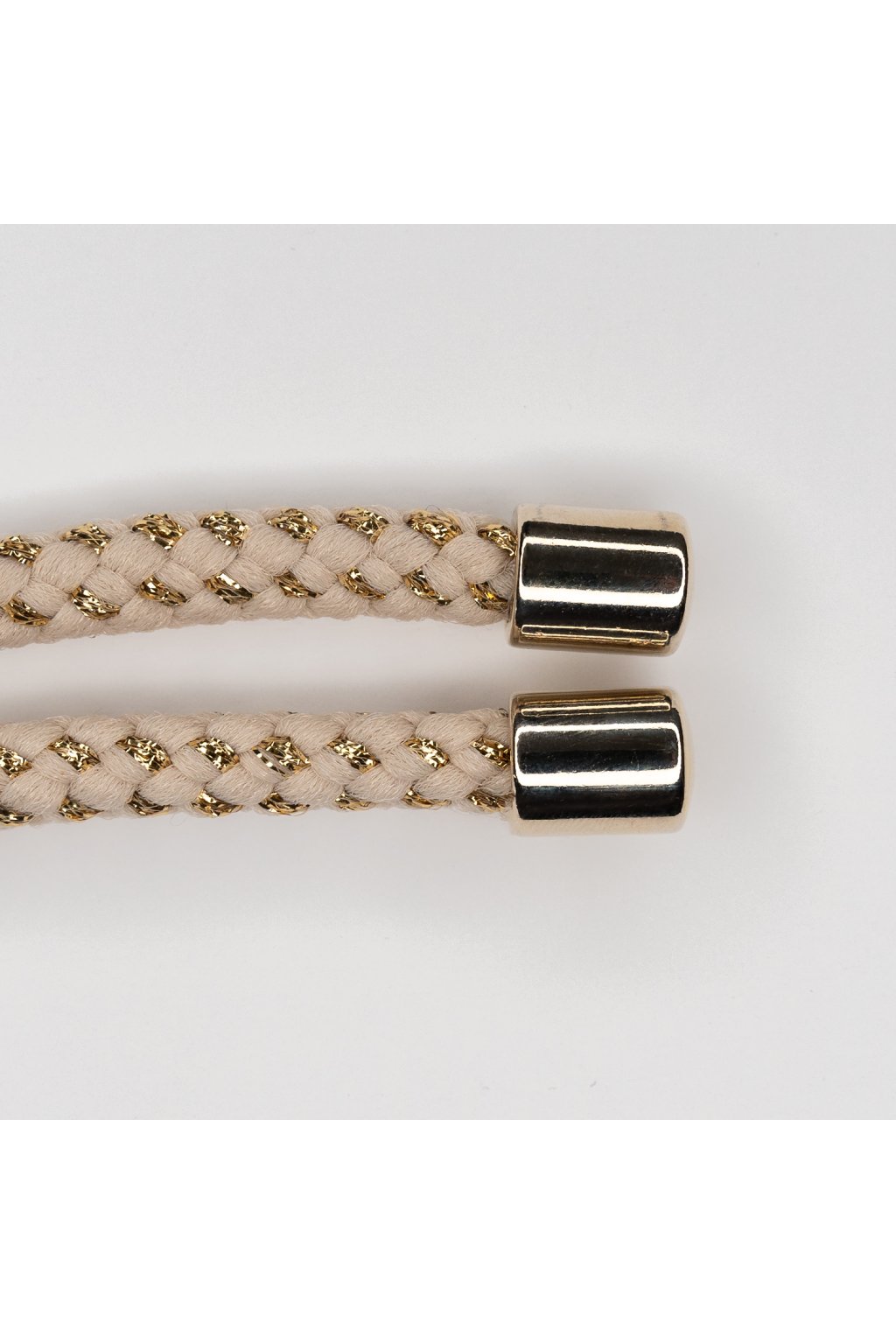 Krémová šnúrka prepletená zlatou niťou s kovovými zlatými koncovkami.