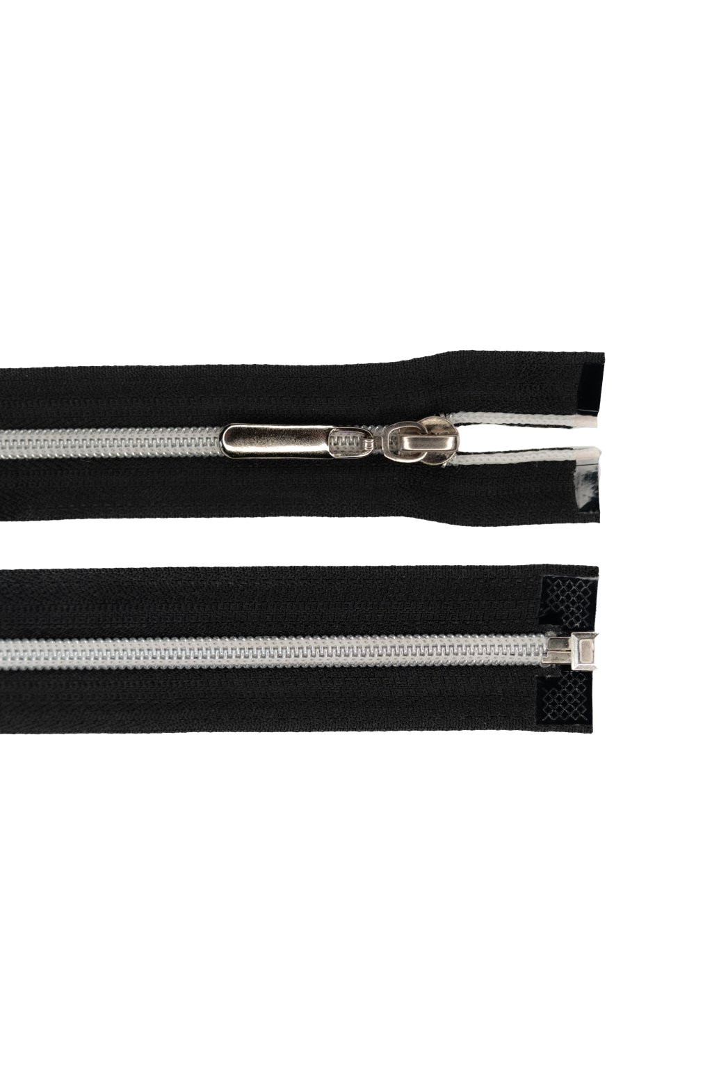 Špirálový zips deliteľný s kvalitnými plastovými zúbkami s kovovým efektom, s hladkým strieborným bežcom. Pri styku s vodou nehrdzavie.