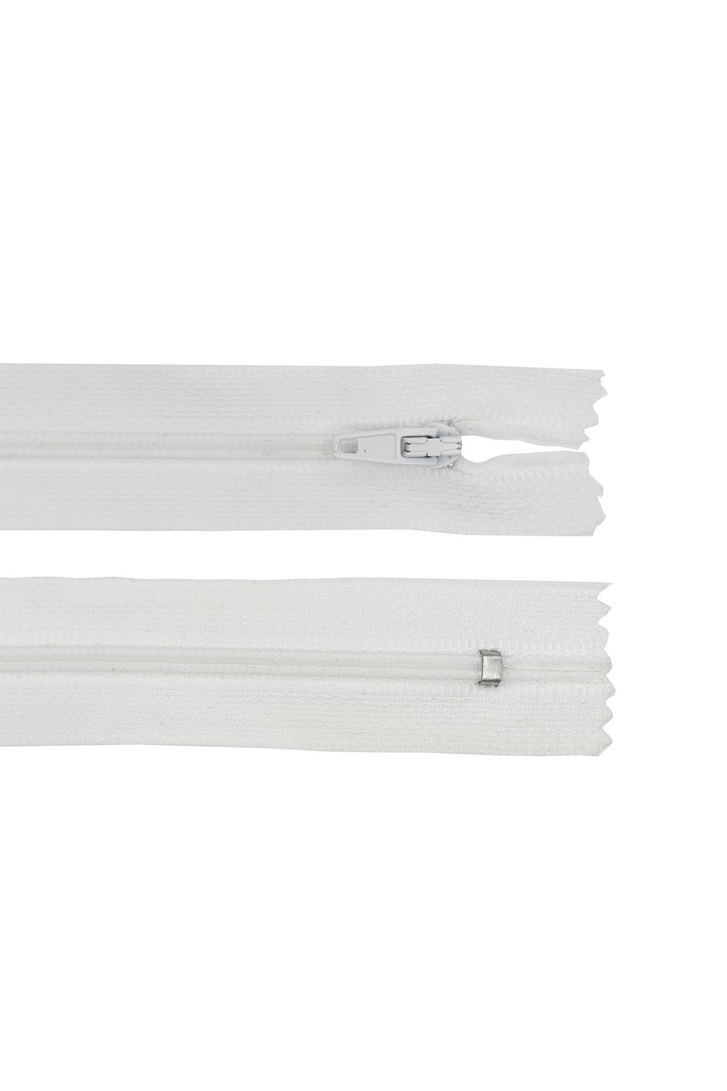 Pevný špirálový zips s nedeliteľnými umelými zúbkami, s hranatým bielym bežcom. Vhodný do nohavíc a sukní. Pri styku s vodou nehrdzavie.