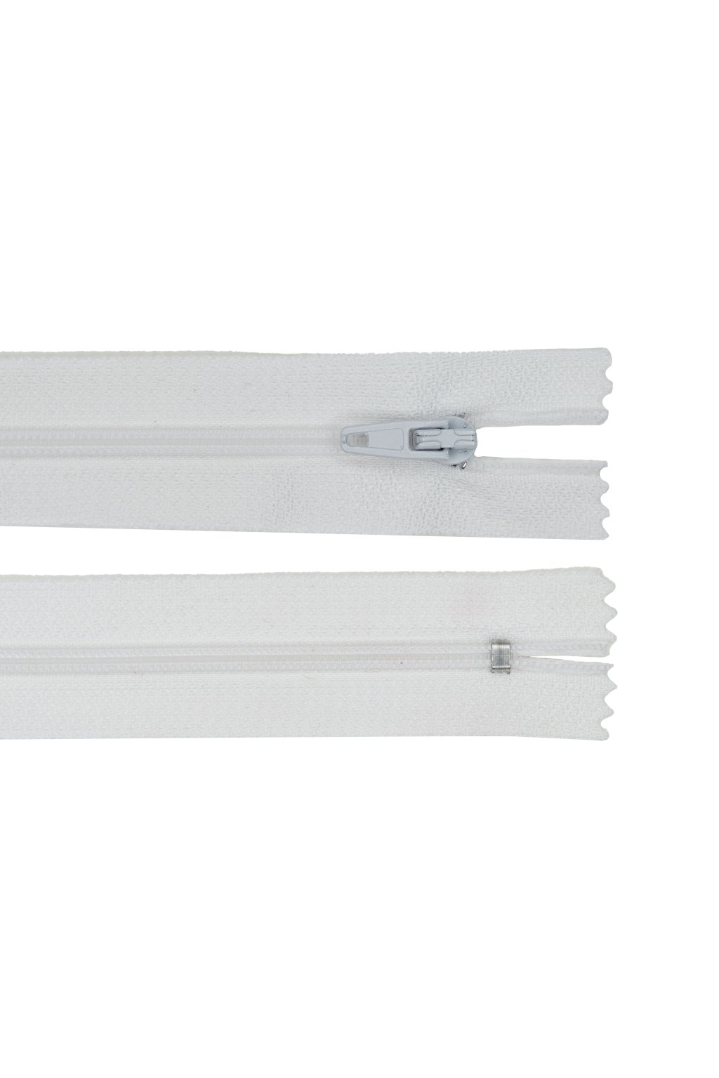 Pevný špirálový zips s nedeliteľnými umelými zúbkami, s hranatým bielym bežcom. Vhodný do nohavíc a sukní. Pri styku s vodou nehrdzavie.