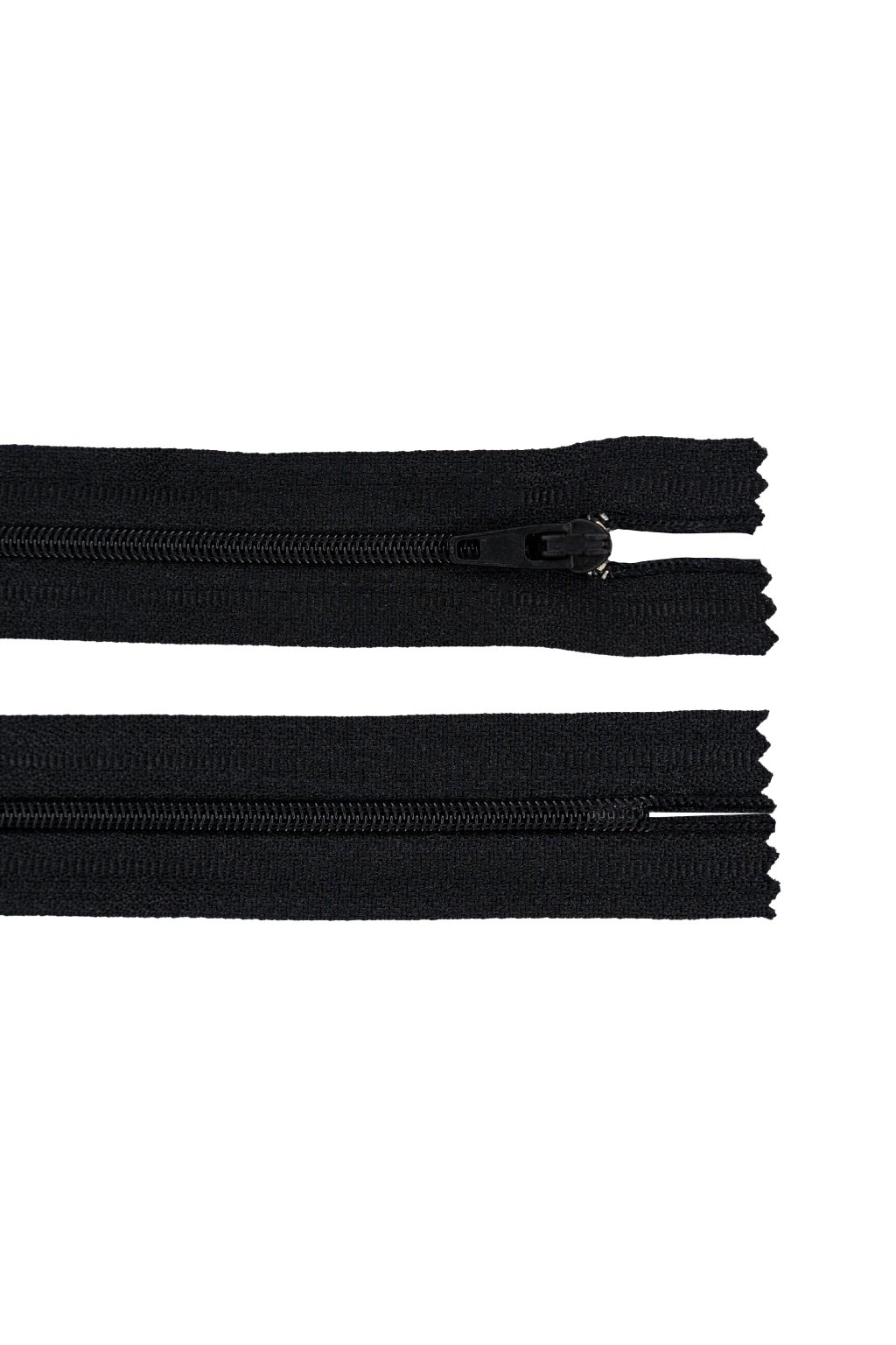 Pevný špirálový zips s nedeliteľnými umelými zúbkami, s hranatým čiernym bežcom. Vhodný do nohavíc a sukní. Pri styku s vodou nehrdzavie.