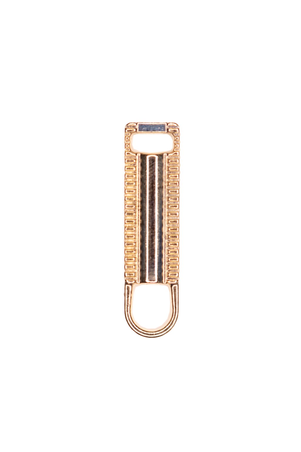 Zipsový ozdobný ťahač zo svetlozlatého kovu obdĺžnikového tvaru.